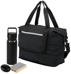 - Features the Voyage Folding Duffel Bag (BG385), Boompods TWS Sleep DreamBuds (EL229), Dual Port Bamboo/rPET Power Bank 5,000mAh (EL226), and 28 oz Urban Peak Dual Top BC Water Bottle